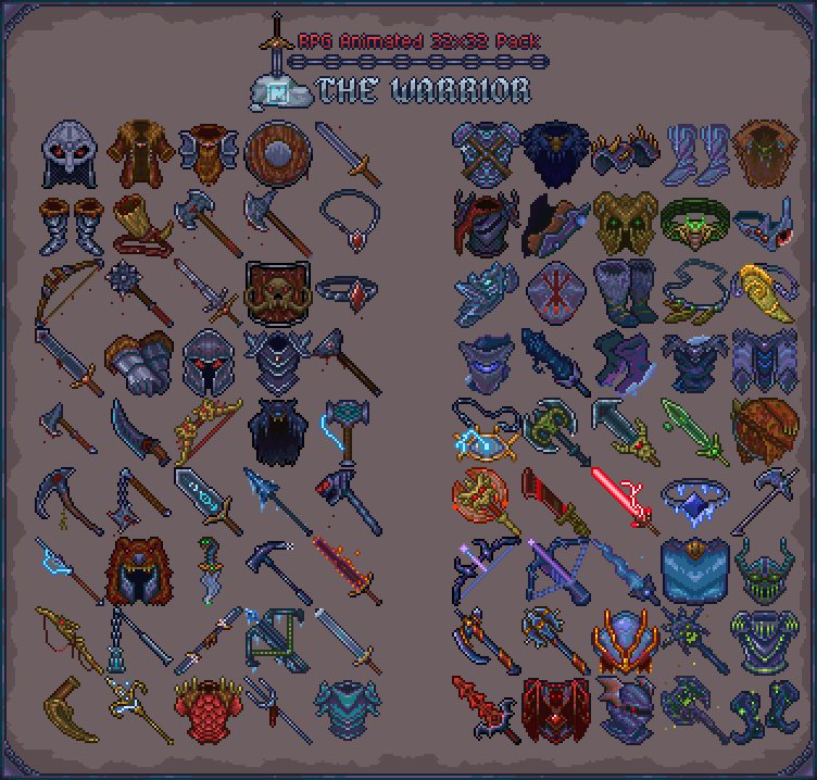 A bold and dynamic Warrior-themed item pack for 2D game developers! Featuring 15 fully animated 32x32 icons (Working on 50 minimum), this pack brings gritty, battle-ready gear to your RPGs, action games, or roguelikes. Perfectly crafted for seamless integration into your project.